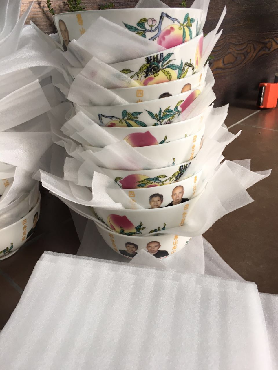 去年,成都的劉女士聯系到了我們,表示自己的父母八十歲了,想要為他們定制一批陶瓷壽碗。客戶想要印制照片和壽桃圖案,我們根據客戶提供的素材與元素,給客戶做好了設計圖。大貨下來,超出了客戶的預期,表示非常滿意。