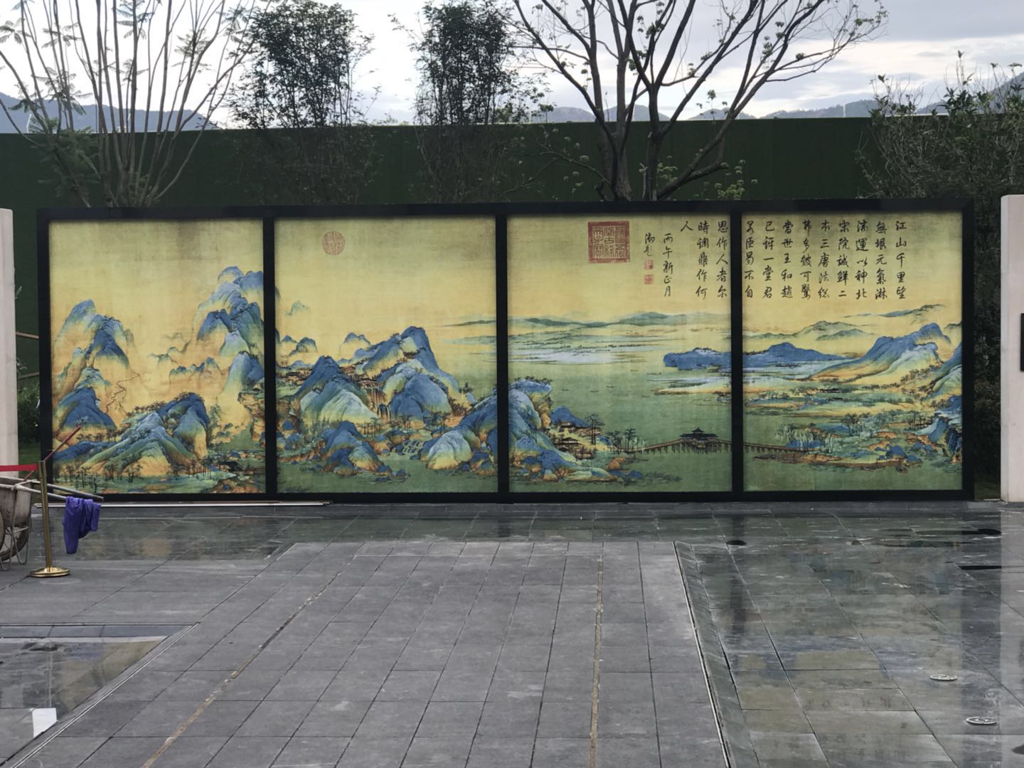 福州林先生打算為青花瓷典展廳準備一塊千里江山圖高溫瓷板畫找到了我們辰天陶瓷,我司在與林先生溝通,決定通過24塊瓷板畫拼接成一整塊千里江山圖瓷板畫,該瓷板畫定做產品后總尺寸95000*3000,同時還有一塊“江山如此多嬌”圓形瓷板畫。